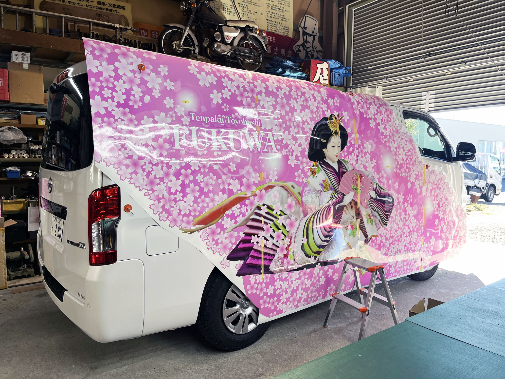 福和工芸様のキャラバンをお預かりしました。 今日から二日間でラッピングを施工させていただきます。