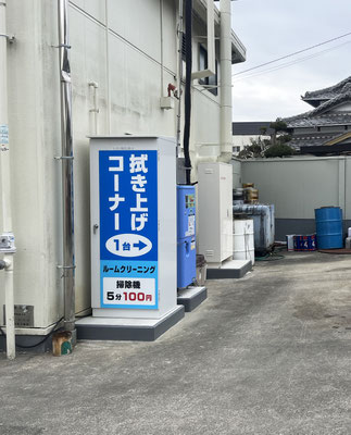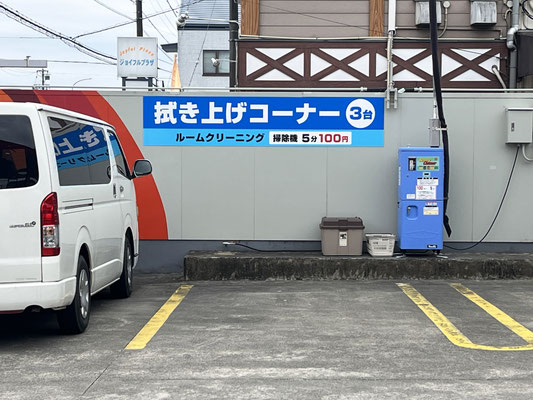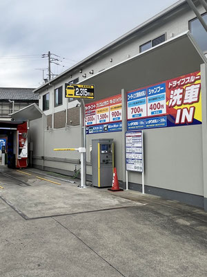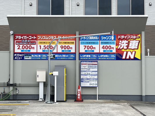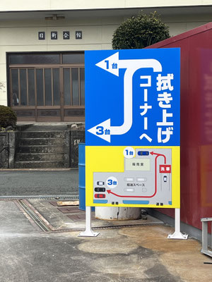 新しくなったセルフ洗車機のメニュー看板・拭き上げコーナーへ誘導する看板