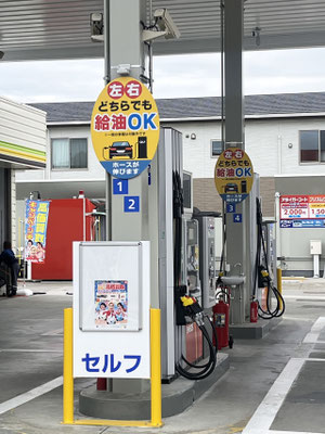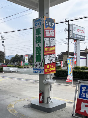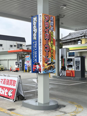 「どちらでも給油OK」の看板・キーパーコーティングやアライガーコートをPRする4面看板 などなど